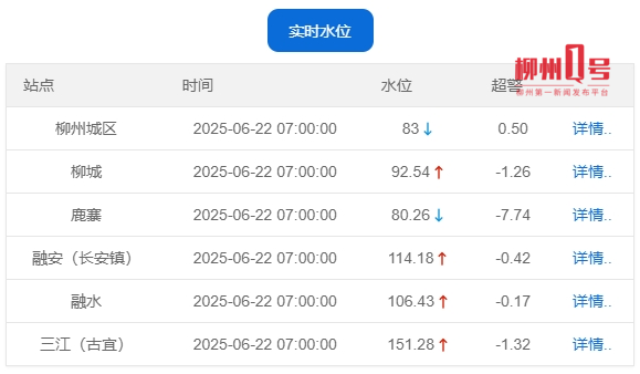 柳江柳州水文站于6月22日16时40分出现83.13米的洪峰水位,超警0.63米(警戒水位82.5米),相应流量15800立方米每秒,为2~5年一遇洪水,目前水位缓慢下降。请沿江有关单位及社会公众关注洪水变化,加强安全防范,做好退水清淤、消毒除菌等善后工作。