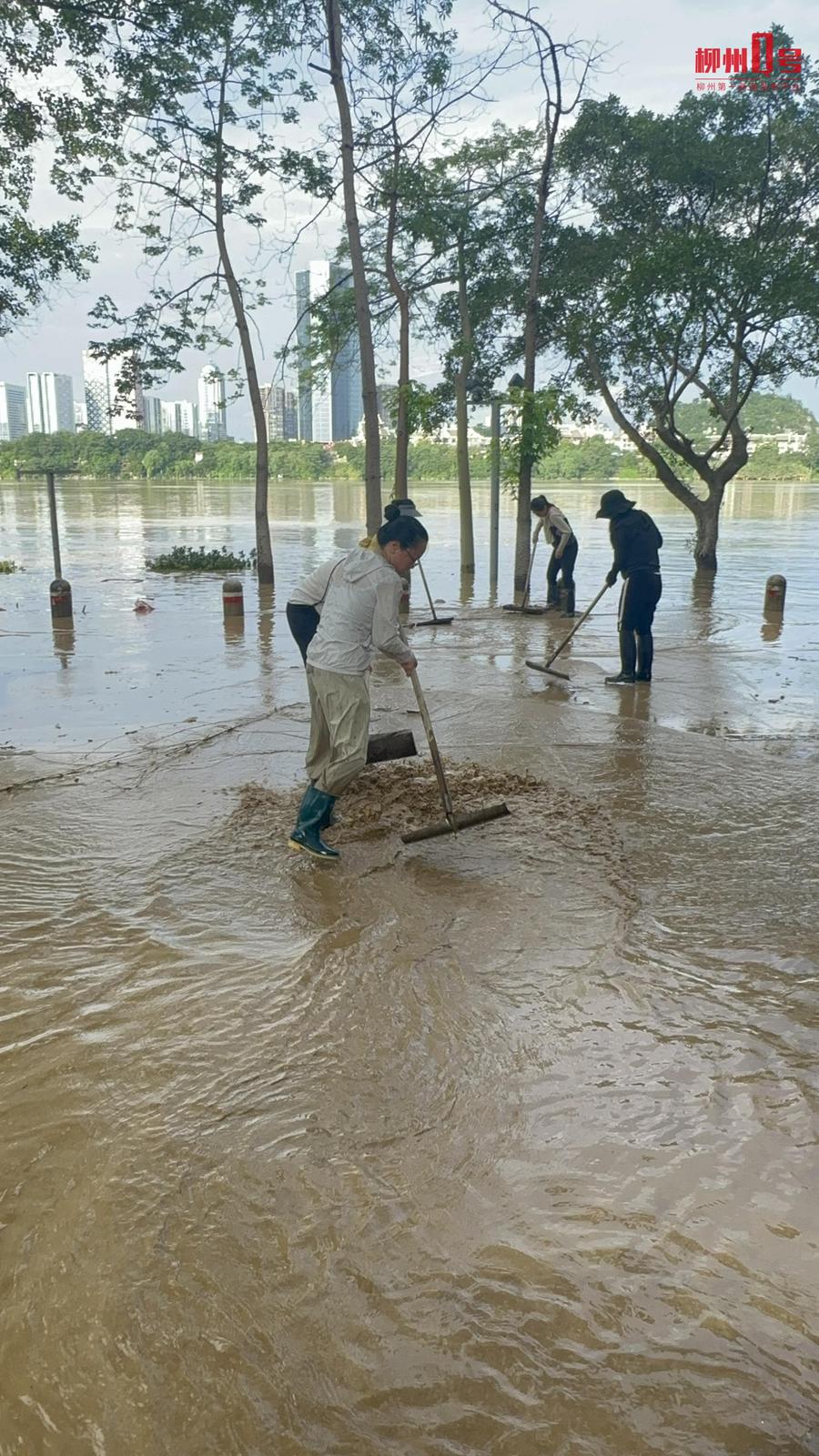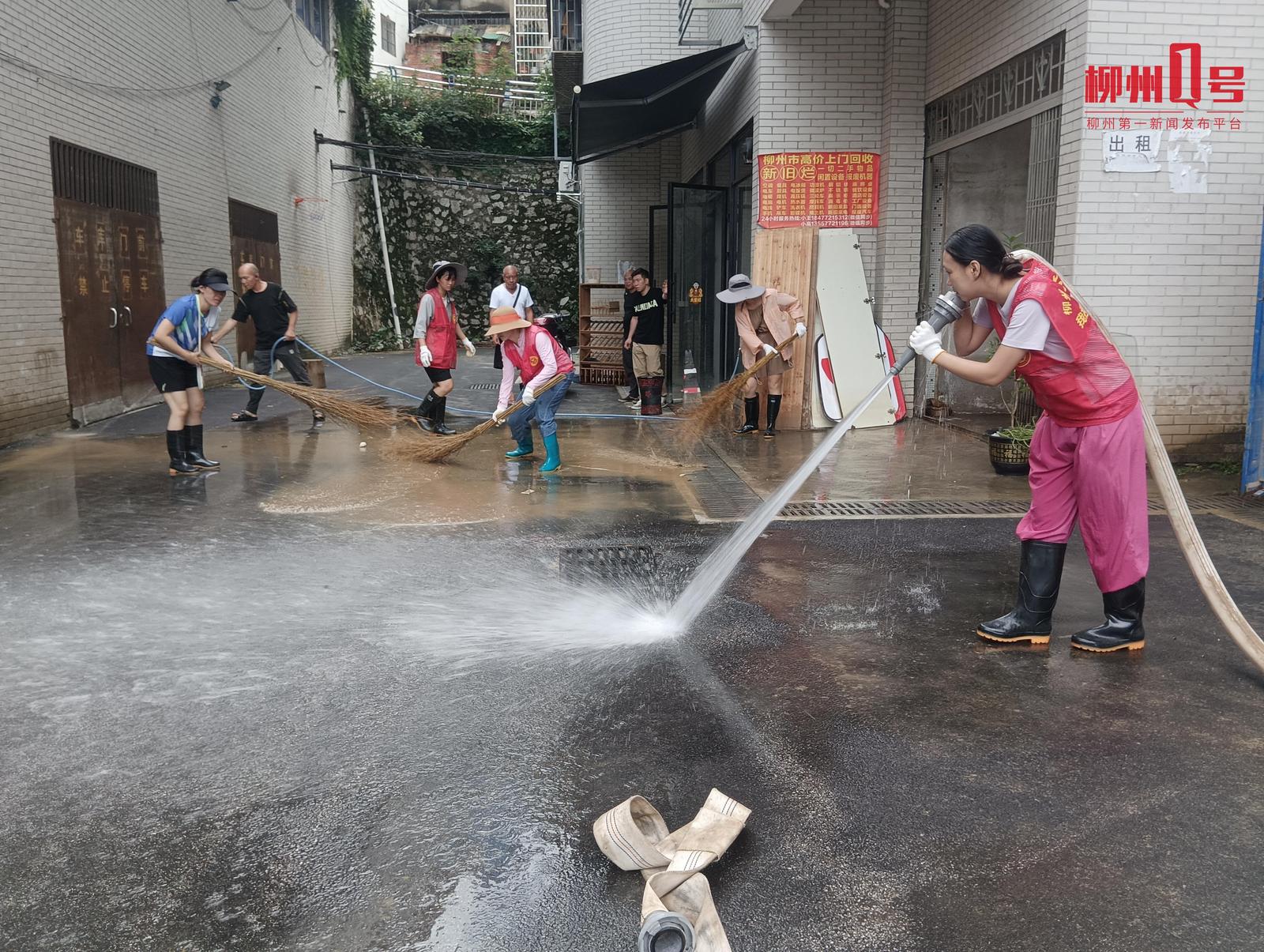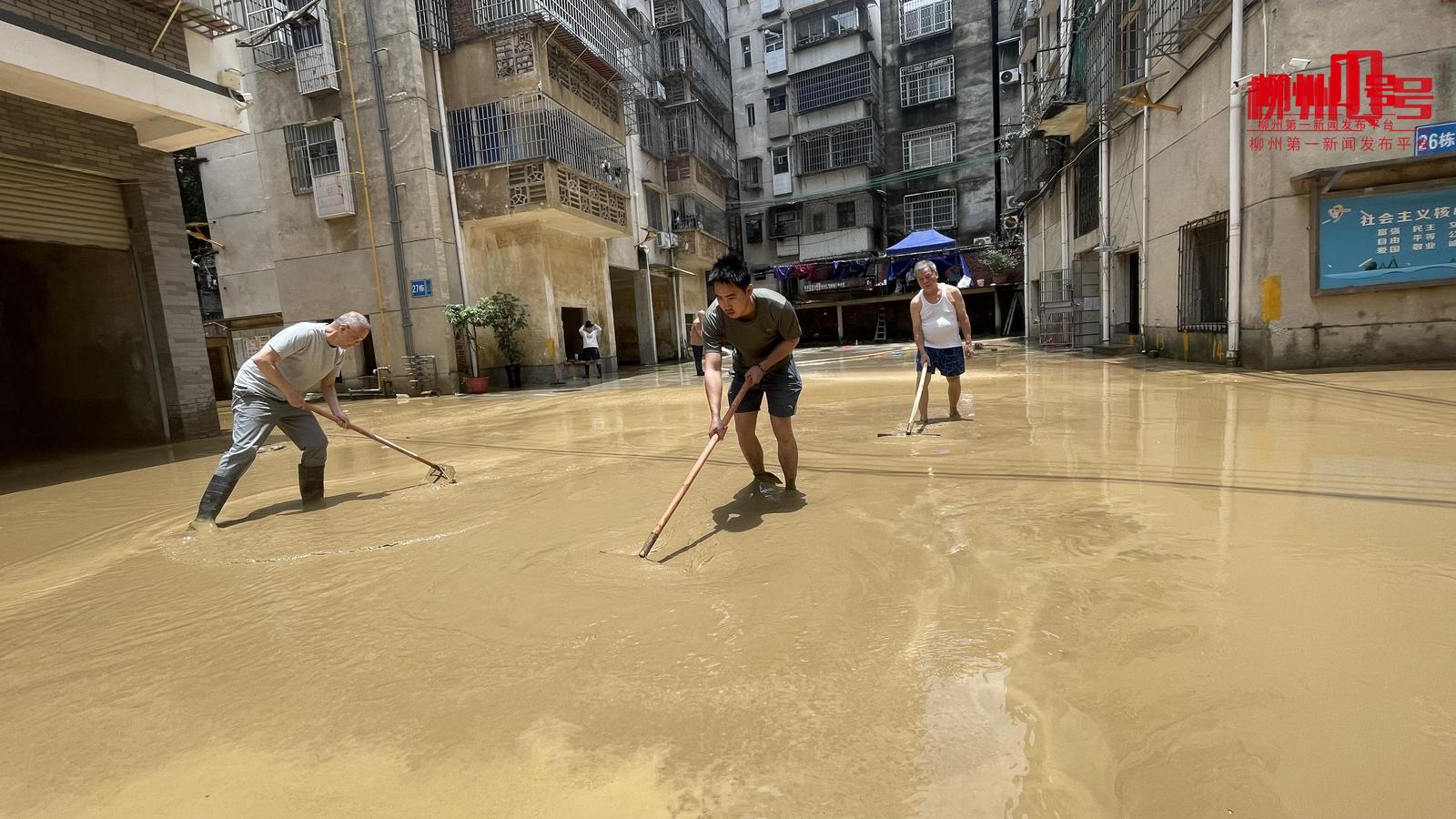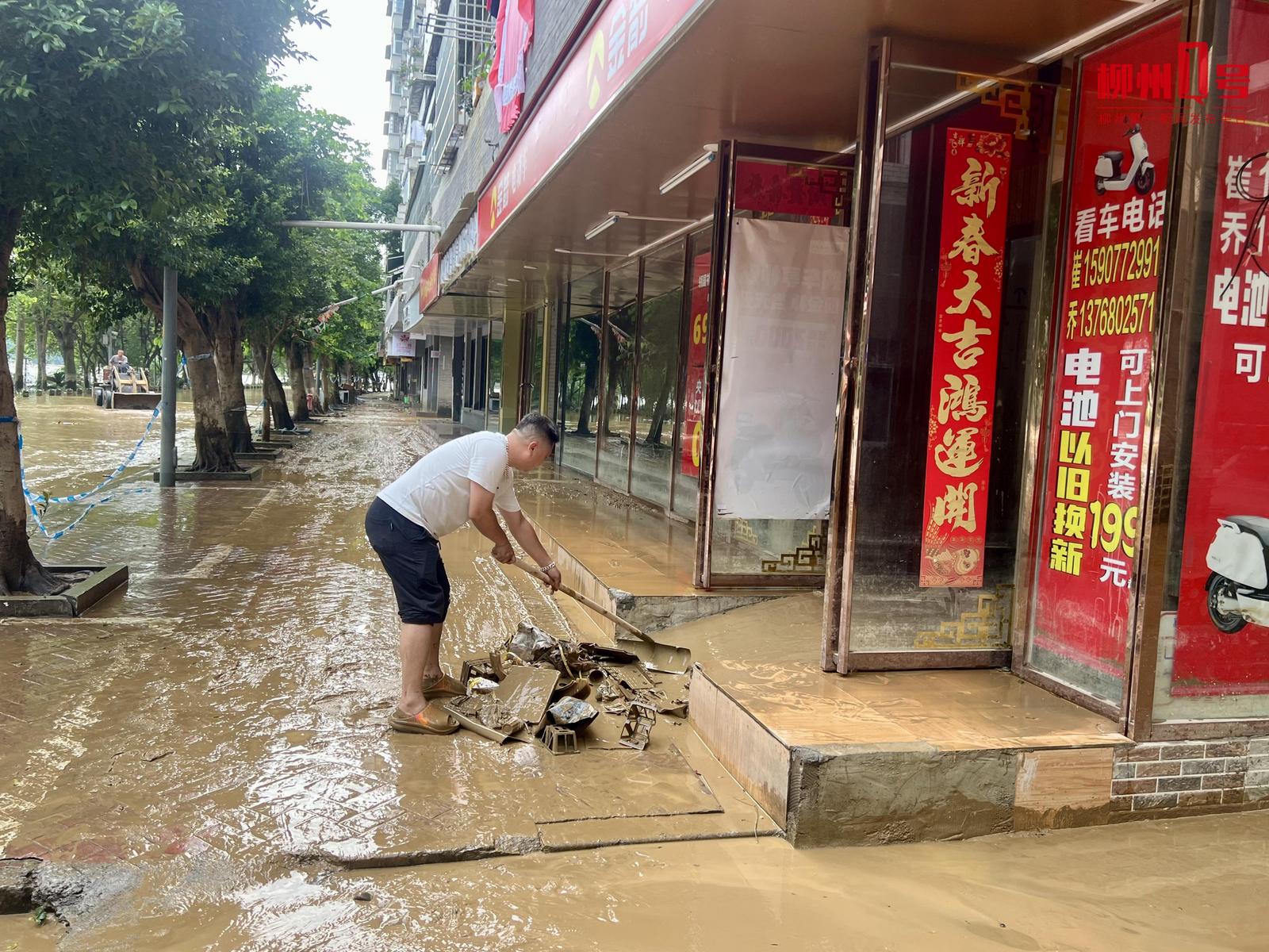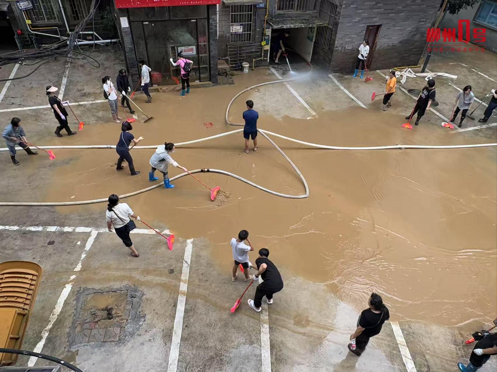 23日12时30分左右,柳江水位回落,在滨江西路的小区居民开始自助清淤。