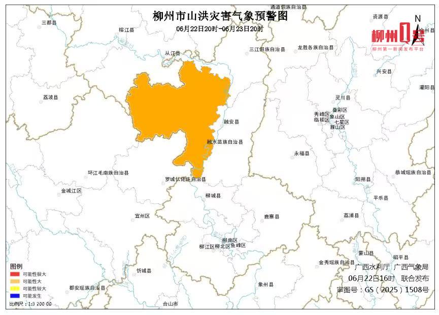 预计6月22日20时至6月23日20时,融水苗族自治县可能发生山洪灾害,其中融水苗族自治县发生山洪灾害可能性大(橙色预警)。请各影响区注意做好监测、巡查、预警和转移避险等山洪灾害防范工作。