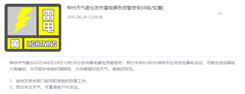 柳州市气象台6月24日12时28分发布雷电黄色预警信号:预计未来6小时内柳州市区将发生雷电活动,可能会造成雷电灾害事故,并可能伴有短时强降雨、大风等强对流天气,请做好防范。