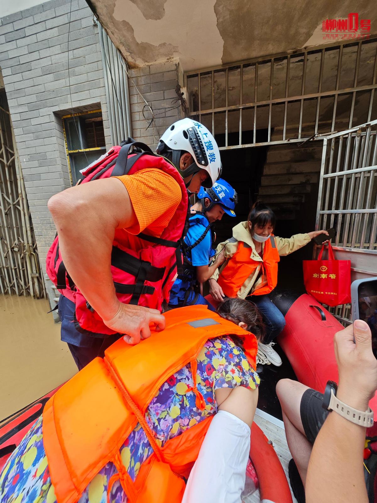 柳州市应急志愿者协会救援人员用皮划艇转运群众。