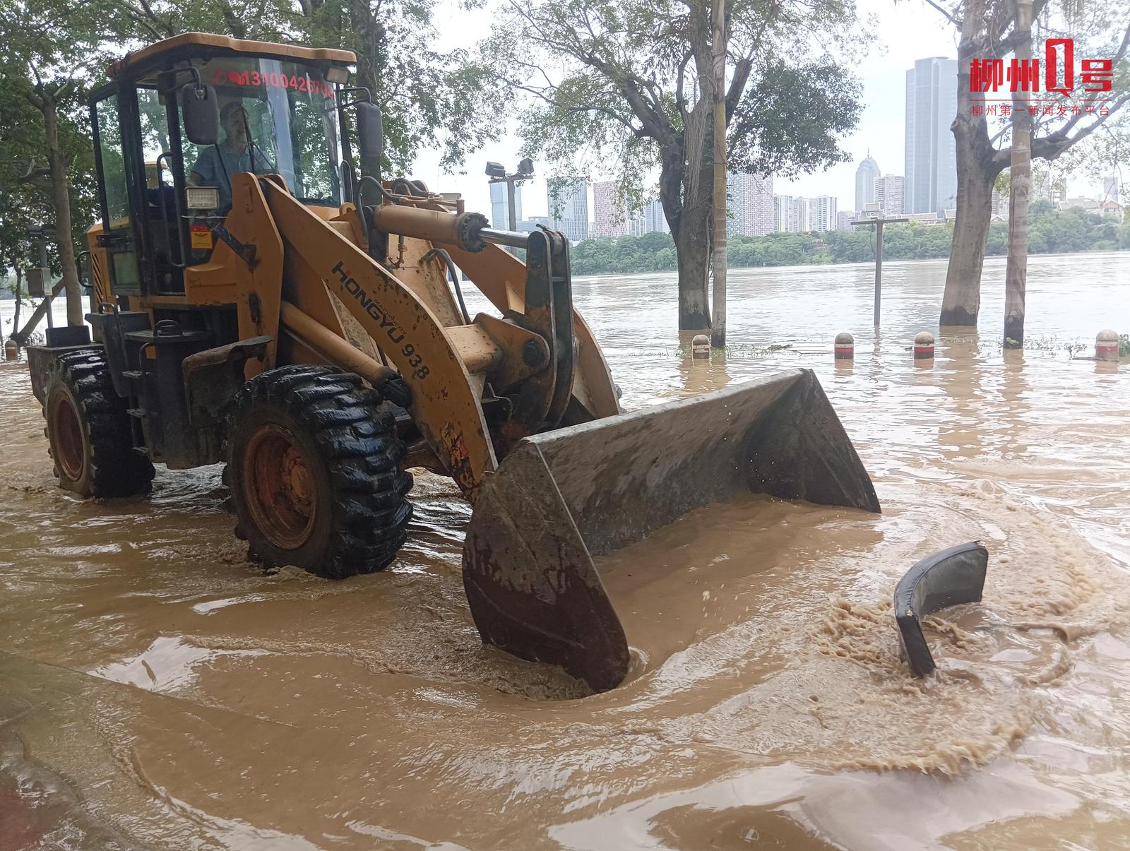 由于受上游影响,目前柳江水位回落较慢,工程车正在不间断推动淤泥,减少堆积,降低后续清理难度。