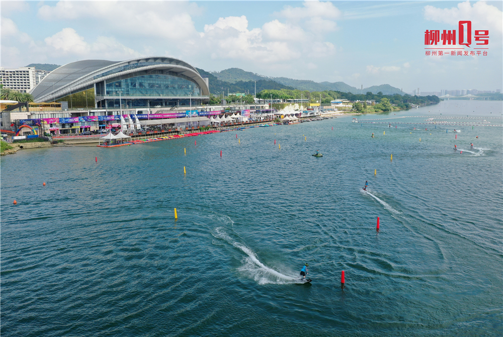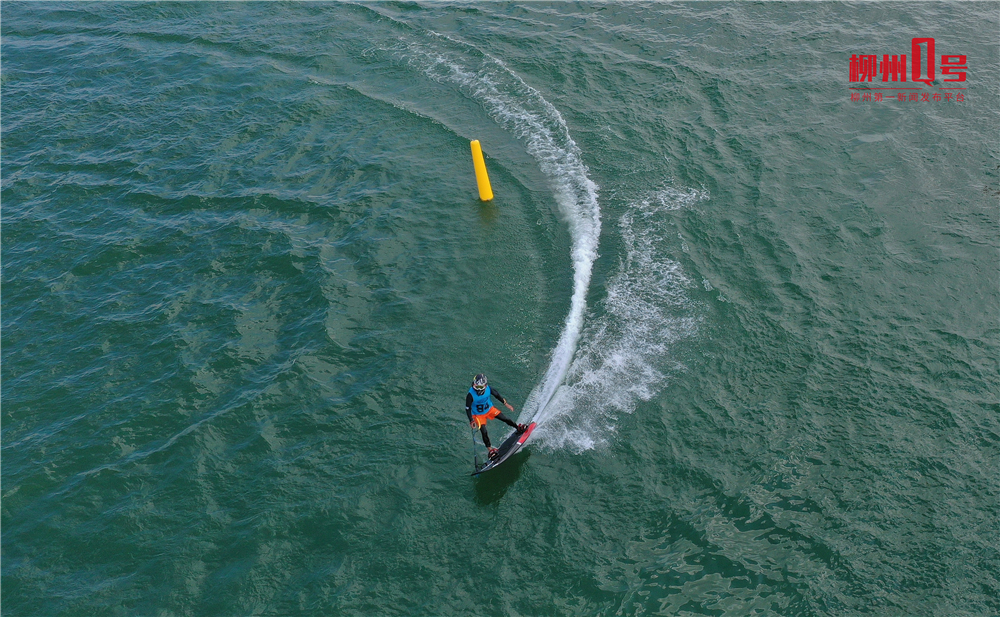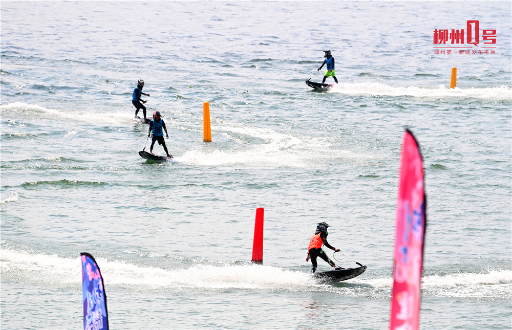 选手们驾驭着动力冲浪板在江面上风驰电掣。