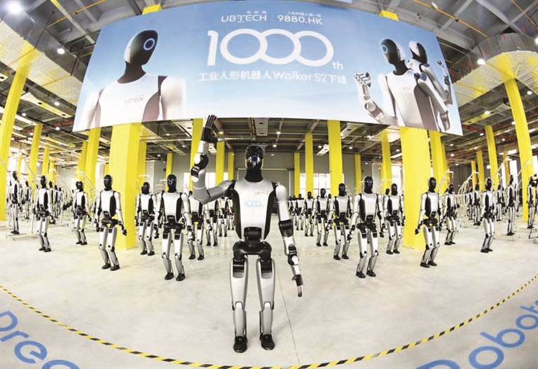 两百余台人形机器人组成恢宏方阵,宛如即将出征的铠甲战队。一台刚走下生产线的机器人穿越方阵小跑而来,挥着手说:“我是优必选柳州机器人超级智慧工厂生产的第1000台工业人形机器人Walker S2……”