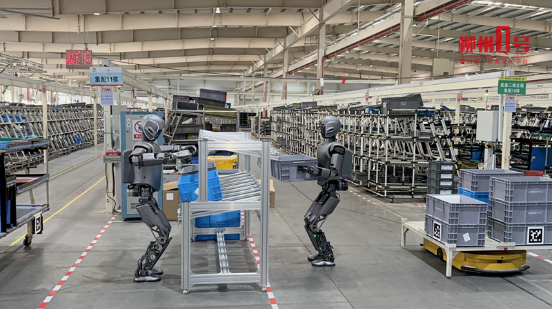 记者在东风柳汽商用车智能制造工厂看到,一台优必选人形机器人正用“手”抓取物料并放入物料箱,另一台人形机器人则将物料箱放置于无人物流车上。紧接着,无人物流车便将物料箱运送至对应的装配工位。