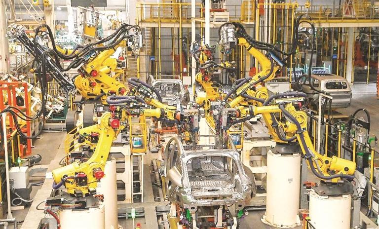 在东风柳汽的乘用车生产基地里,工业机器人挥舞臂膀组装汽车。(资料图 全媒体记者 黄蕊 摄)