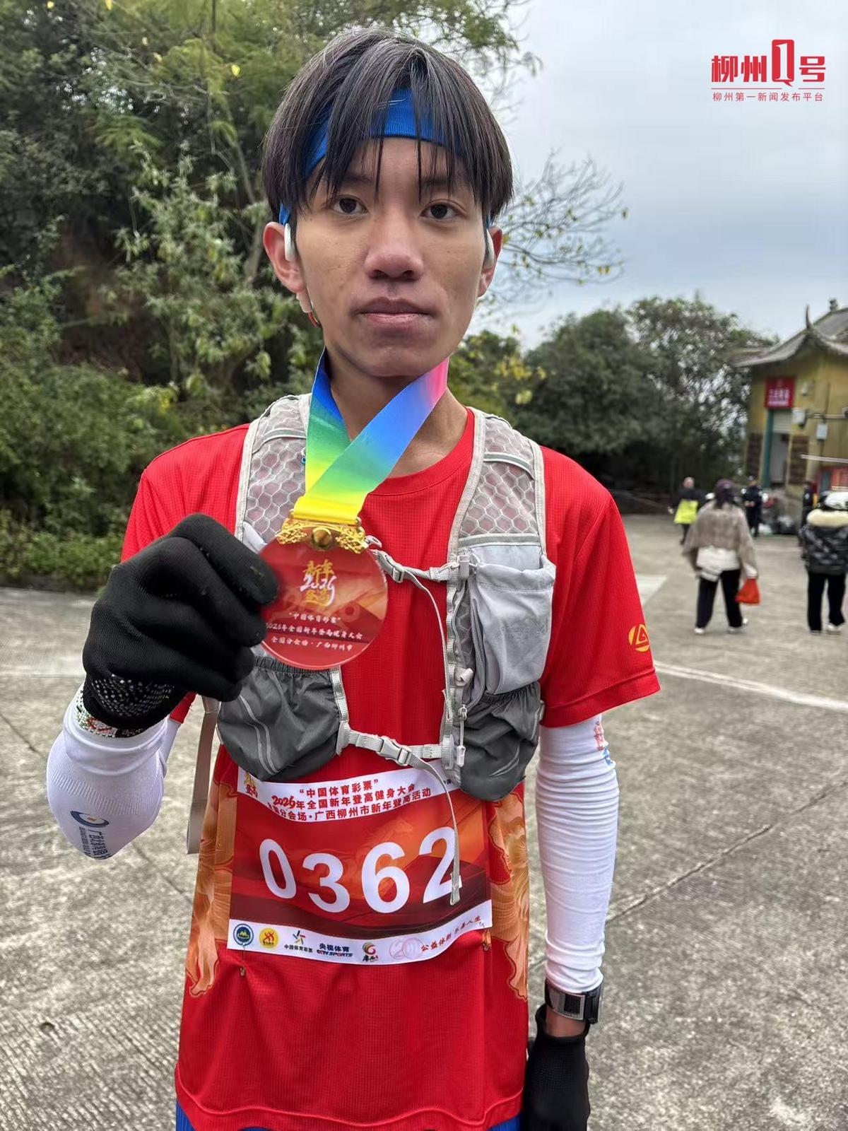 “我今天用了32分钟的时间抵达山顶。天气冷途中脚有些酸,最后还是坚持下来了,居然是第一名,这个成绩也给自己新的一年开了个好头。”22岁的黄宝发来自柳州职业技术大学,新的一年,他希望自己能实现从军梦想,为祖国贡献自己的力量。